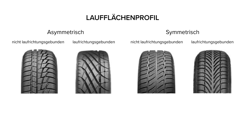 - das Laufflächenprofil (symmetrisch, asymmetrisch, laufrichtungsgebunden, nicht laufrichtungsgebunden)