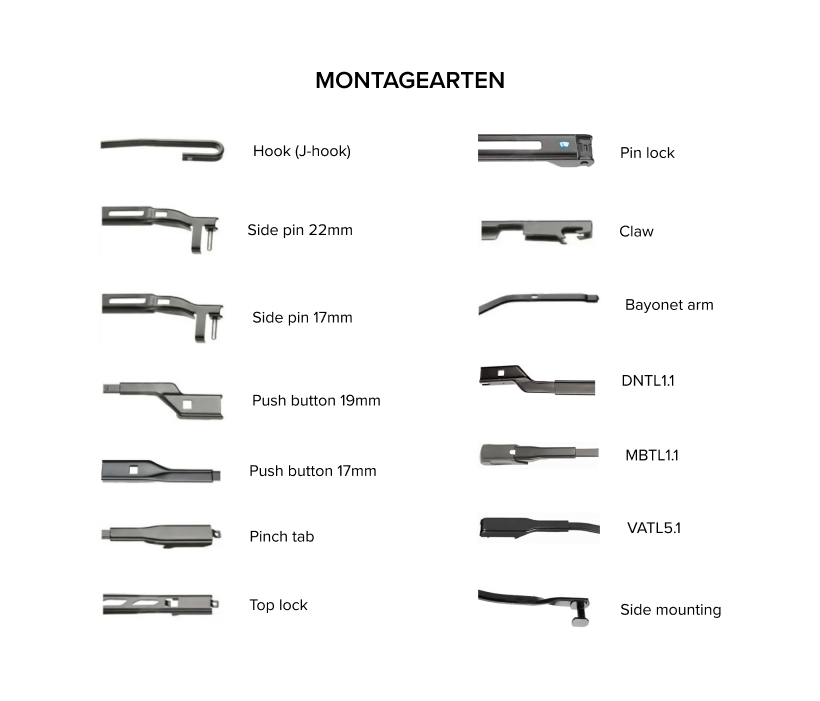 Seitenmontage. Mit einem kleinen Adapter auf dem Ende des Wischerarms. Wird nur bei bestimmten Renault-Modellen und älteren Fahrzeugen aus US-amerikanischer Produktion verwendet.