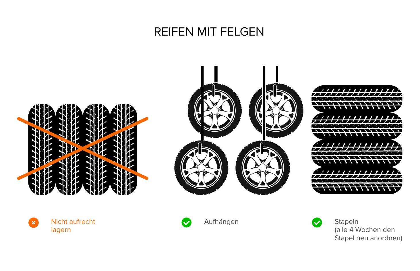 Wir empfehlen, deine Reifen in einem kühlen, mäßig feuchten Raum auf einem speziellen Reifenständer zu lagern. Du kannst sie auch in speziellen Taschen aufbewahren.