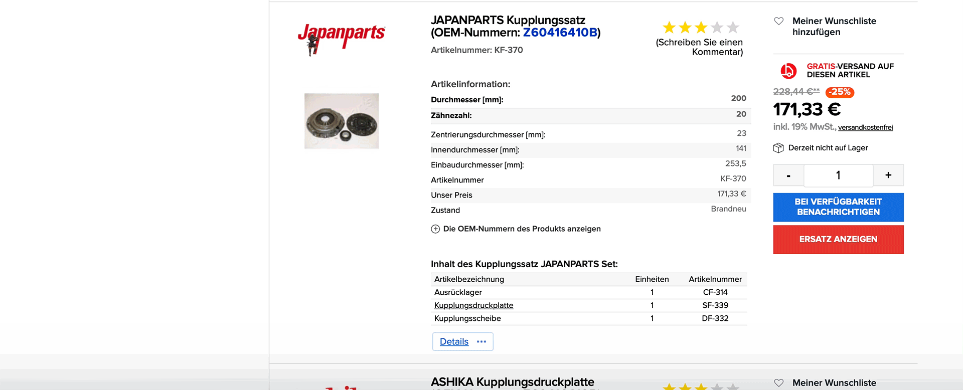 Eine Liste von Alternativen wird angezeigt, wenn Sie per OE-Nummer nach Teilen suchen. Eine Alternative ist ein Produkt, das ähnliche oder identische Eigenschaften hat. Stellen Sie sicher, dass Sie direkt nachdem Sie die OE-Nummer eingegeben haben die Eigenschaften der aufgelisteten Alternativen vergleichen. Wenn mehrere Suchresultate vorliegen, von denen Sie auswählen müssen, lesen und vergleichen Sie die Eigenschaften der alternativen Produkte genau oder bitten Sie unseren Kundenservice um Hilfe. Wenn das Ersatzteil, das Sie benötigen, nicht auf Lager ist, verwenden Sie den "Ersatz anzeigen" Button. Sie werden eine Liste von Produkten mit ähnlichen oder identischen Eigenschaften, aber von anderen Marken und möglicherweise anderen Preiskategorien, sehen.