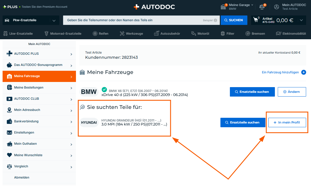 Sollten Sie mehr Fahrzeuge zu Ihrer Garage hinzufügen, können Sie jedes Fahrzeug aus der Rubrik "Sie suchten Teile für" auswählen und auf "In mein Profil" klicken. Es wird sofort zu Ihrer Fahrzeugliste hinzugefügt.