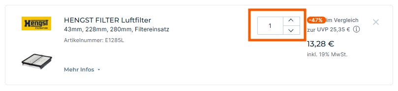 Um die Anzahl der Artikel zu erhöhen/verringern: