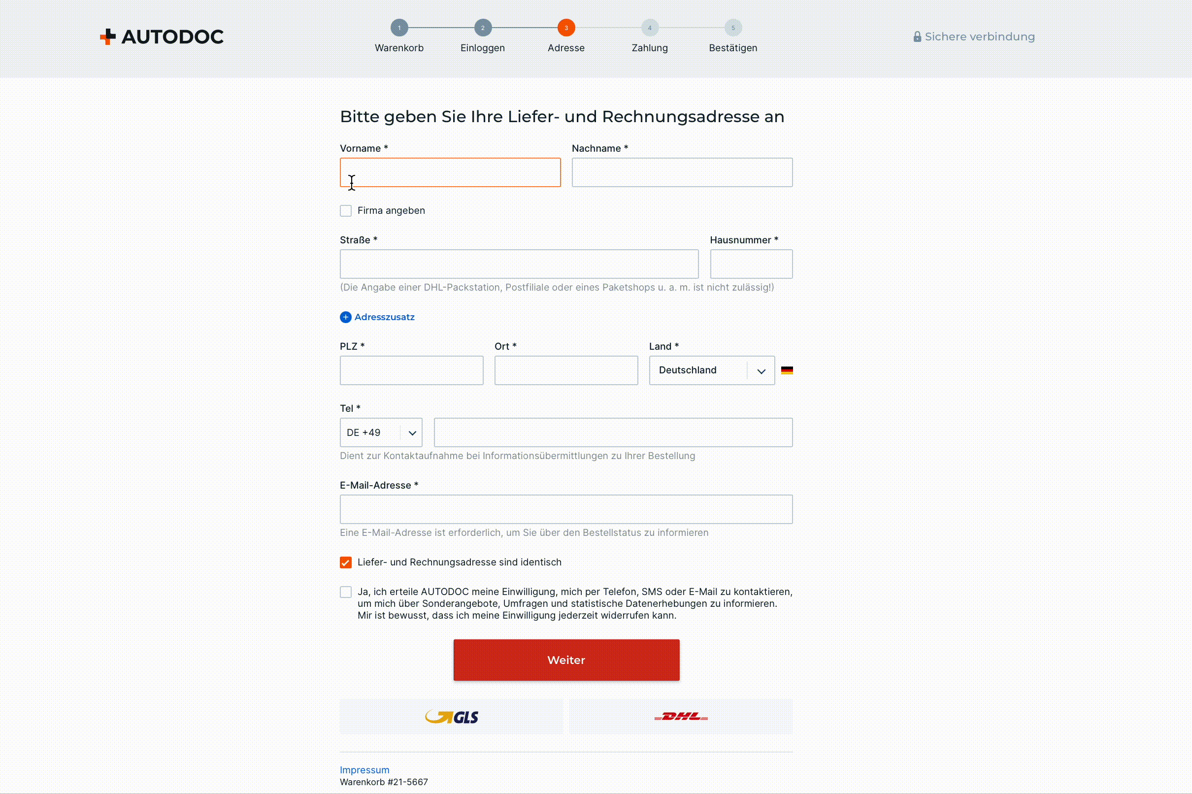 Beachte bitte: Das Zielland der Lieferung muss mit der Sprache der verwendeten Website übereinstimmen. Verwende zum Beispiel autodoc.co.uk, um eine Bestellung mit Lieferung nach Großbritannien aufzugeben. Andernfalls können bestimmte Produktkategorien nicht geliefert werden (z. B. Sperrgut).
